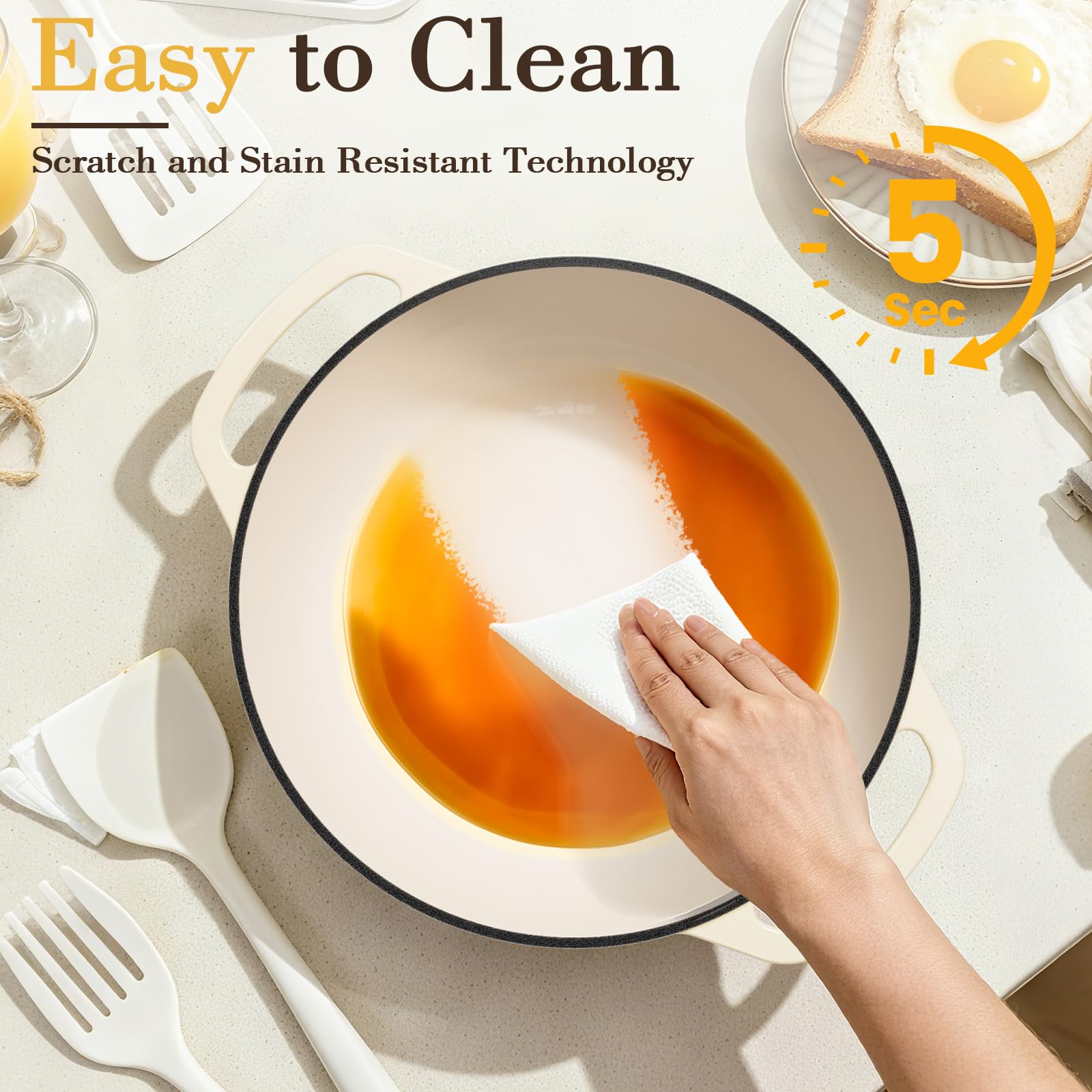 - 【Effortless Cleaning & Chip-Resistant Enamel】Enjoy the ultimate combination of easy maintenance and lasting beauty. The smooth, glossy enamel interior is naturally non-stick and highly resistant to stains—even from tomato-based sauces—making cleanup as simple as a quick rinse with soap and water. Crafted from durable, food-grade materials, this chip-resistant surface is not only easy to care for but also ensures a safe, non-toxic cooking experience that protects the pure flavor of your food