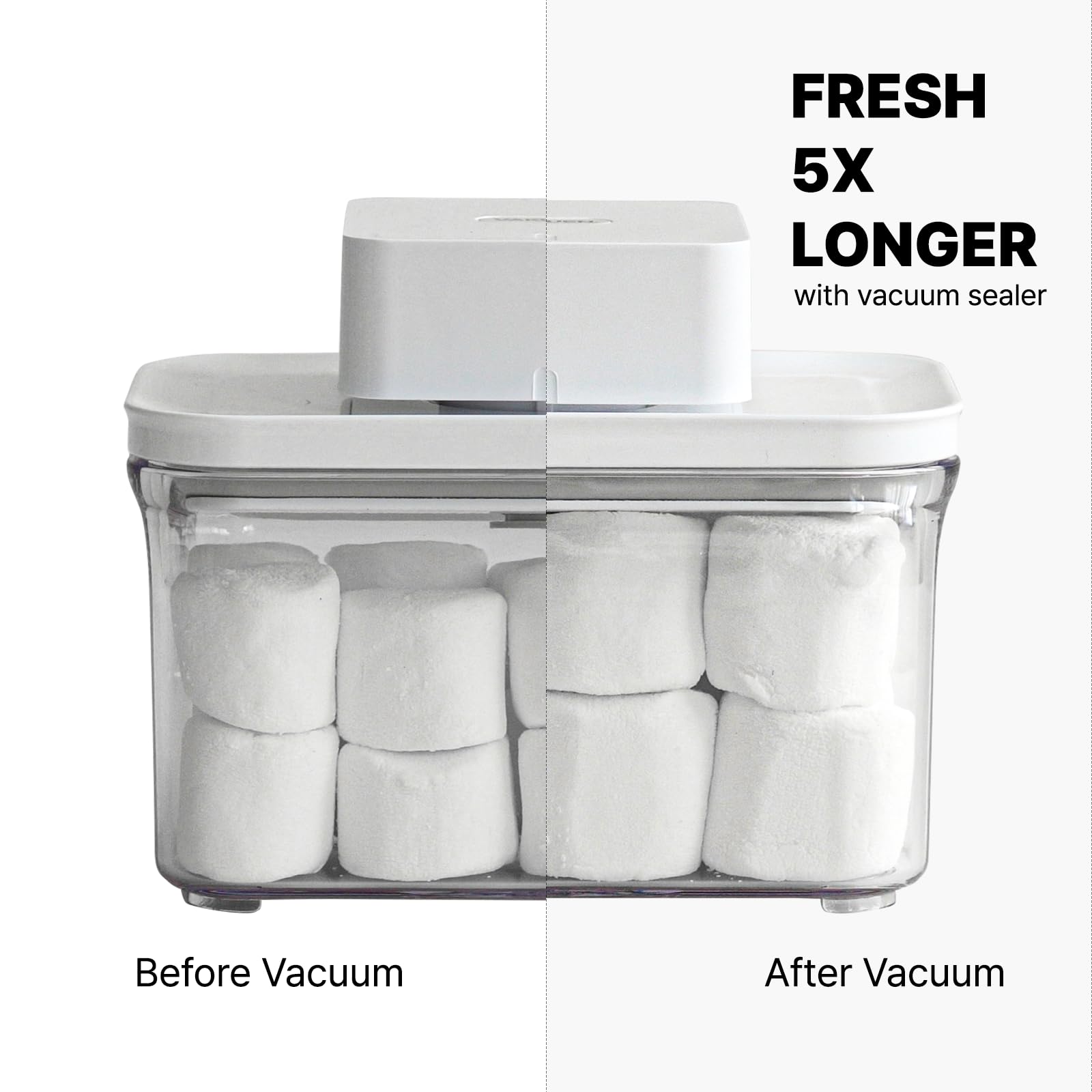 - FULL VACUUM STORAGE; VAKUEN DICE vacuum pump quickly removes the air inside the container in seconds. Vacuum operation automatically stops once it reaches sufficient vacuum state (-25 KPA). It prolongs the lifecycle of food up to 5 times longer than non-vacuum storage containers.