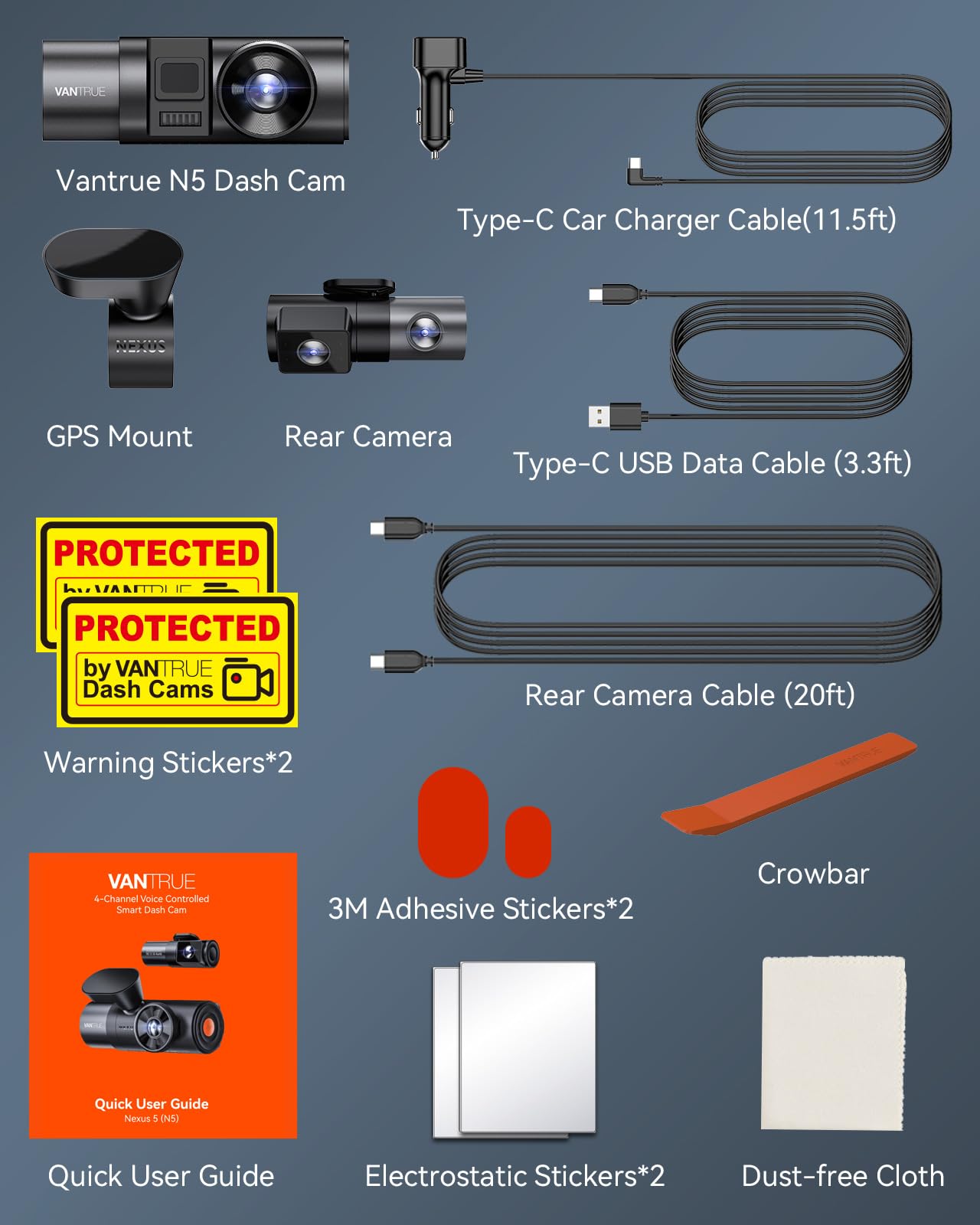 - [ 18 Months Warranty ] Vantrue N5 comes with an extendable 18-month warranty, constantly updated firmware version for improvements and new features, peace of mind with no monthly subscriptions or fees required. Available languages are English, French, Spanish, Chinese, etc. Auto LCD off avoids screen distracting to improve safety when driving. Audio recording can be turned off for privacy. N5 supports up to 512GB SD card. (Buy Separately)