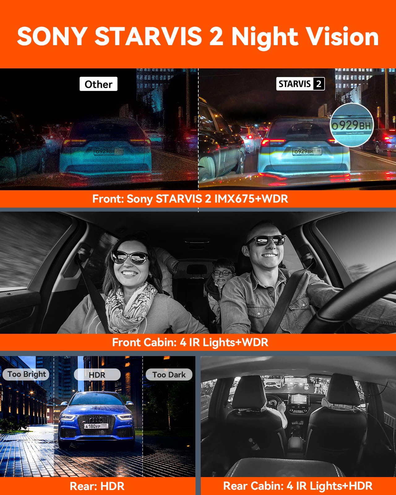 - [ STARVIS 2 & IR Night Vision ] STARVIS 2’s remarkable performance in NIR and noise reduction allows this 4 way dash camera to captures high-speed objects including license plates clearly even in dark or backlighting conditions. Front inside and rear inside cameras with infrared lights record crisp cabin images even in unlit environment, greatly improve nighttime driving safety, making it a perfect choice for Uber, Rideshare, Lyft, Taxi, commercial fleet drivers and families.