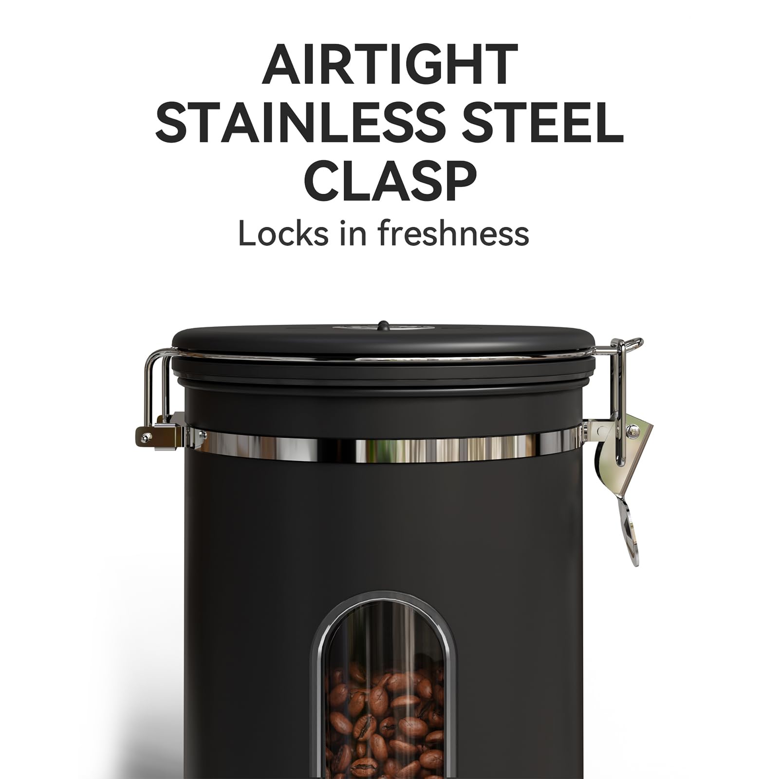- Date Tracker, Window, & Free Scoop:Keep your coffee fresh by setting storage or expiry dates with our date tracker on the lid. A handy window lets you see how many beans are left without opening the canister; Plus, we provide a free stainless steel coffee scoop that attaches with a hook