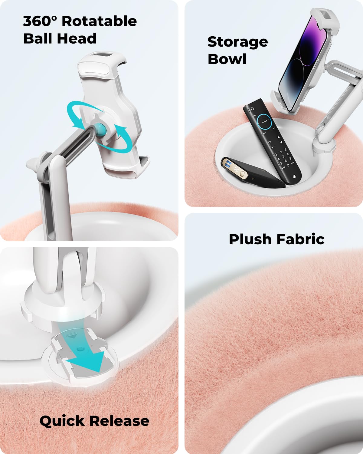 Viozon Tablet Stand Pillow, Compatible with 4.7"-13" Phone/Tablet, iPad, iPhone, Samsung, Google, Kindle, 360°Adjustable Phone Holder for Bed with Soft Plush Fabric, and Detachable Bowl, Pink
