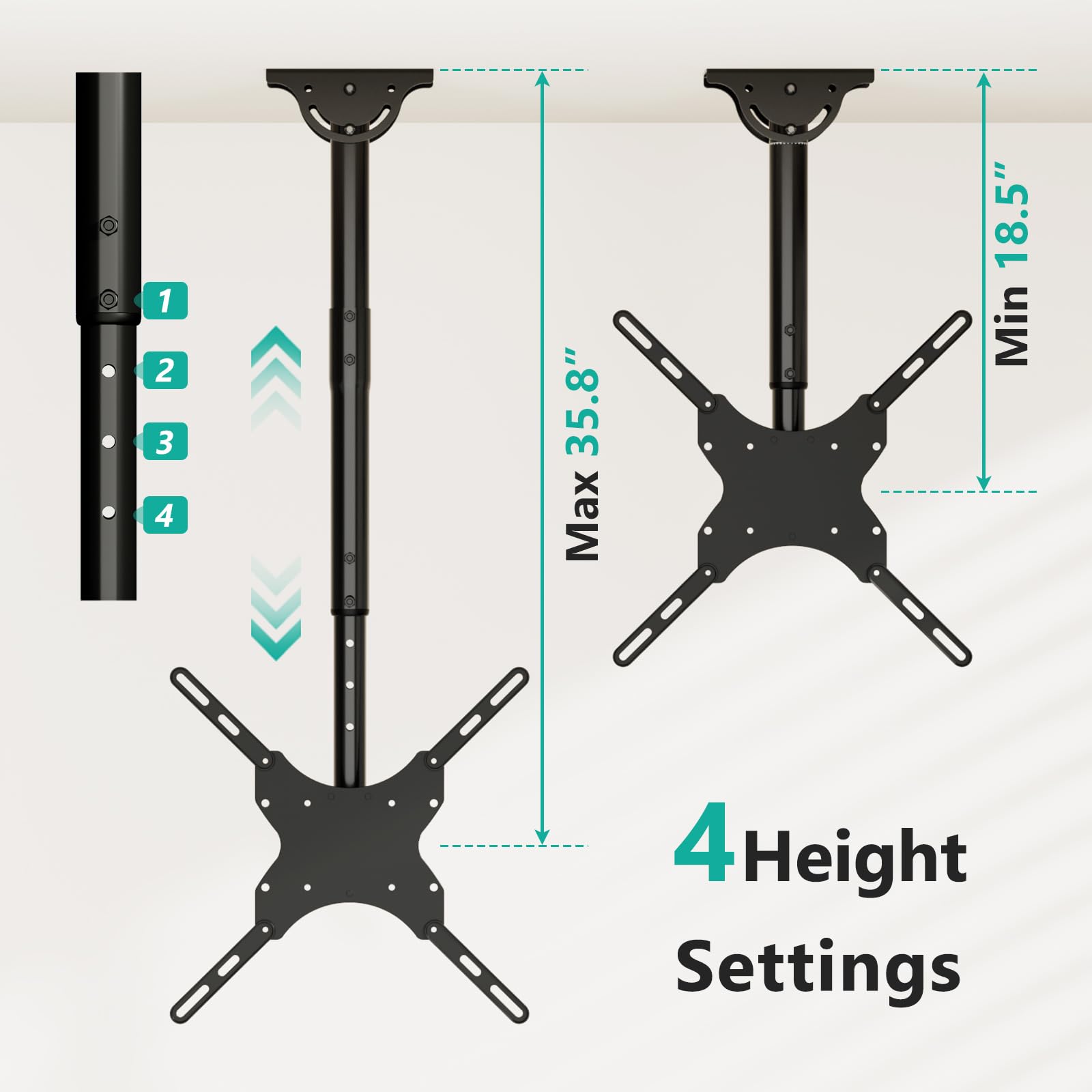 - Adjustment: TV Ceiling Mount can be tilted down 25°, 360° left-right swivel, and 3° rotation in both directions. It also provides 2-inch incremental height adjustment, ranging from 18.5" to 35.8" from ceiling to the center of the mounting plate, ensuring the perfect viewing angle.