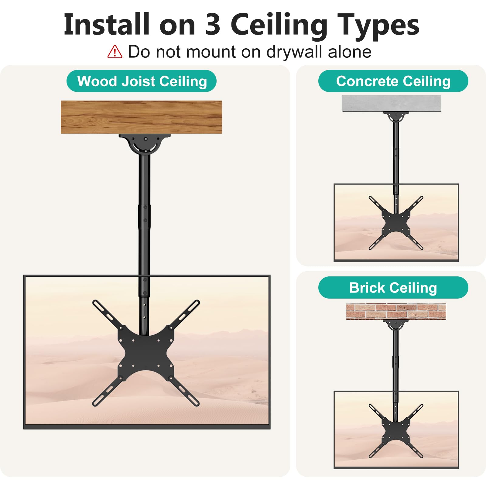 - Ideal Design: Our ceiling TV mount is perfect for high-ceiling homes, bars, restaurants, fitness centers, schools, grocery stores, dental and medical offices, and home installations. This ceiling mount TV bracket offers the flexibility and reliability you need.