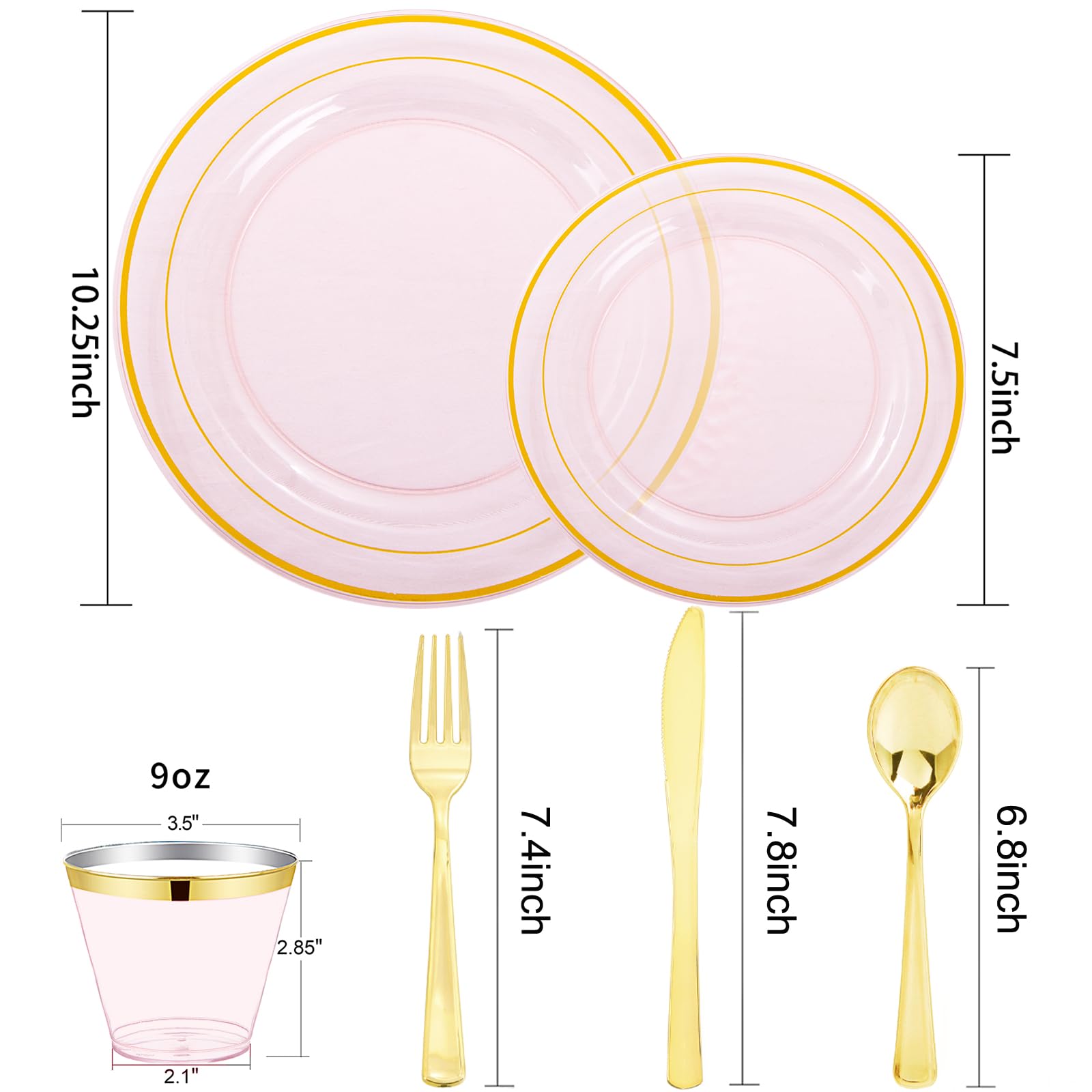 - Great Value: Although intended for single-use, these clear pink and gold rim plates offer a cost-effective alternative compared to traditional porcelain or ceramic ware. This gorgeous pink and gold plates allows hosts to create an opulent atmosphere without the worry of breakage or the need for extensive post-event washing.