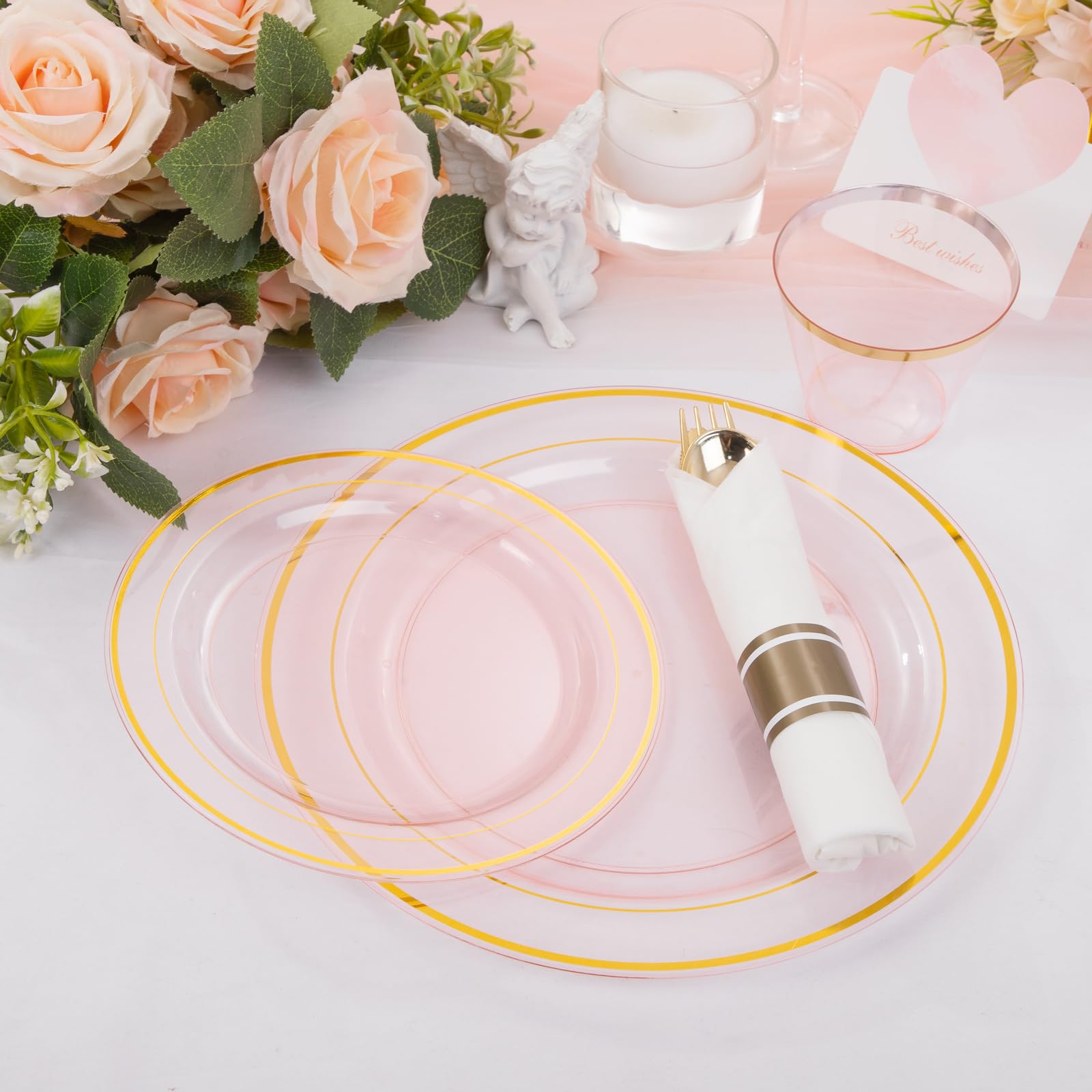 WELLIFE 210Pcs Clear-Pink Plastic Dinnerware- Pink and Gold Plastic Dinnerware include 30 Dinner Plates, 30 Dessert Plates, 90 Gold Silverware, 30 Cups and 30 Napkins Perfect for Parties