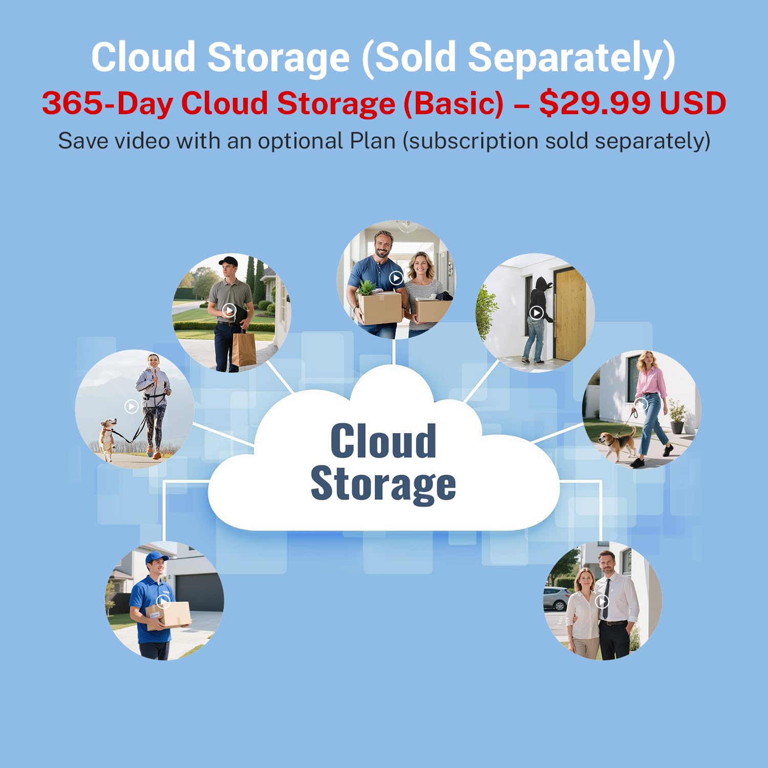 • Cloud Storage: Keep your video footage safe and accessible anytime with secure cloud backup. (sold separately)