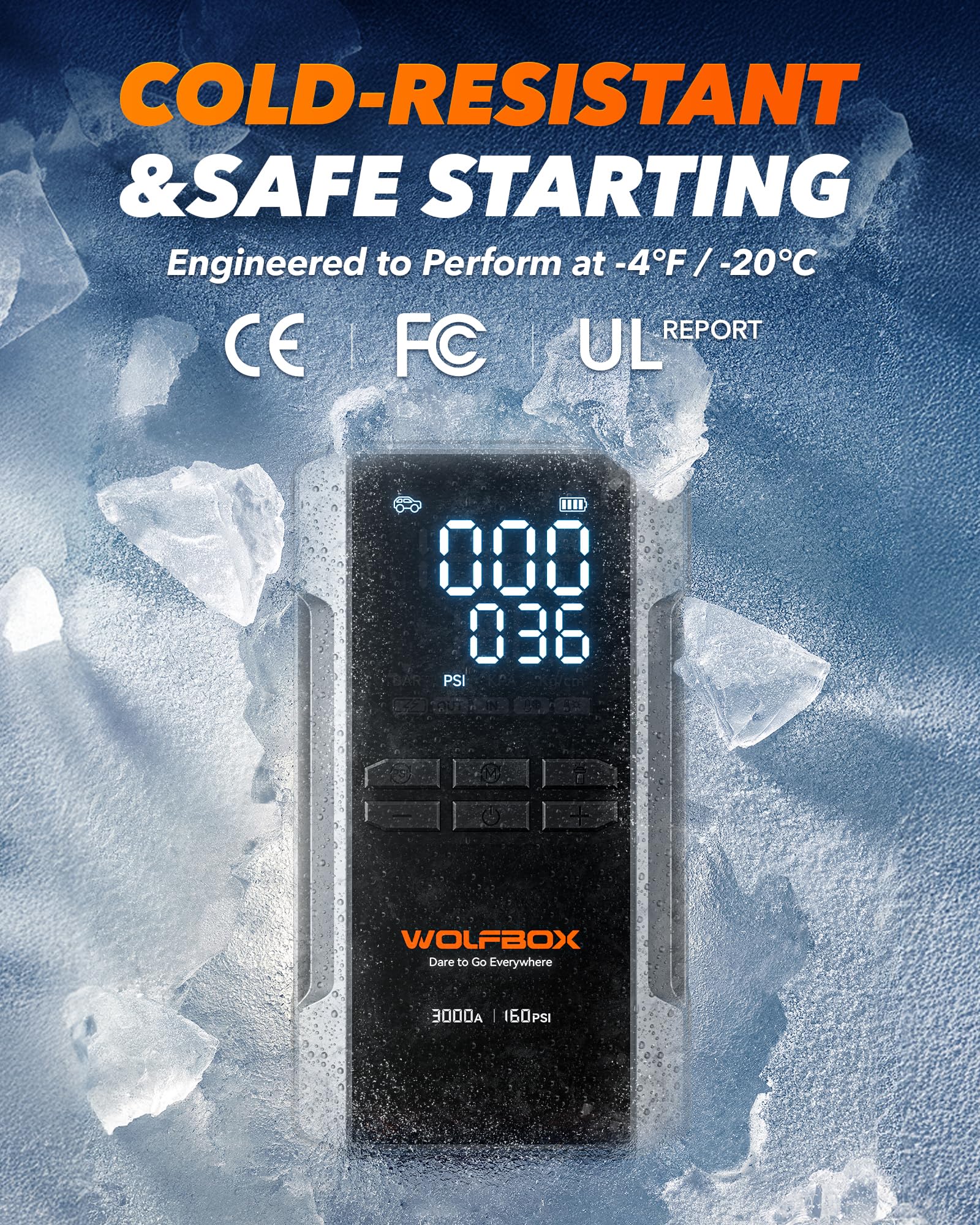 - Operates down to -4°F & 10 Types Protections - The portable battery jump starter with air compressor, rated at IP64 for protection, ensures resilience in harsh environments. Operates at -4°F and survives the cold